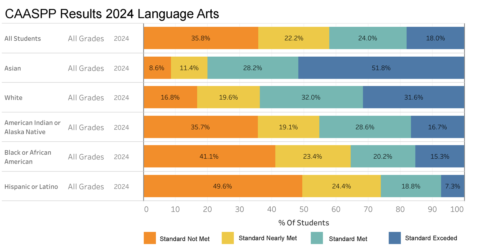 This bar chart displays the 2024 CAASPP results for Language Arts, categorized by different ethnic groups and their achievement levels: Standard Not Met, Standard Nearly Met, Standard Met, and Standard Exceeded. It illustrates a varied performance across groups, with Asian students notably excelling as more than half exceeded the standard. In contrast, Hispanic or Latino students have a higher percentage nearly meeting the standard, indicating a significant potential for improvement. The chart highlights the diverse educational outcomes and underscores the importance of targeted support and resources to enhance language arts proficiency across all groups, aiming to reduce disparities and foster academic success.