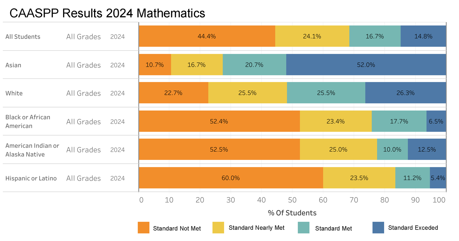 This bar chart displays the 2024 CAASPP Mathematics results, detailing student performance across different ethnic groups, segmented into four categories: Standard Not Met, Standard Nearly Met, Standard Met, and Standard Exceeded. The chart reveals considerable variability in mathematics proficiency among the groups. Notably, a significant proportion of Asian and White students met or exceeded the standards, with Asian students having a slightly higher rate of exceeding. In contrast, Black or African American and American Indian or Alaska Native students show a larger percentage nearly meeting the standard, which highlights the need for additional support to help these students reach higher proficiency levels. This data is essential for educators and policymakers to understand educational disparities and to drive efforts aimed at improving math education for all student groups.