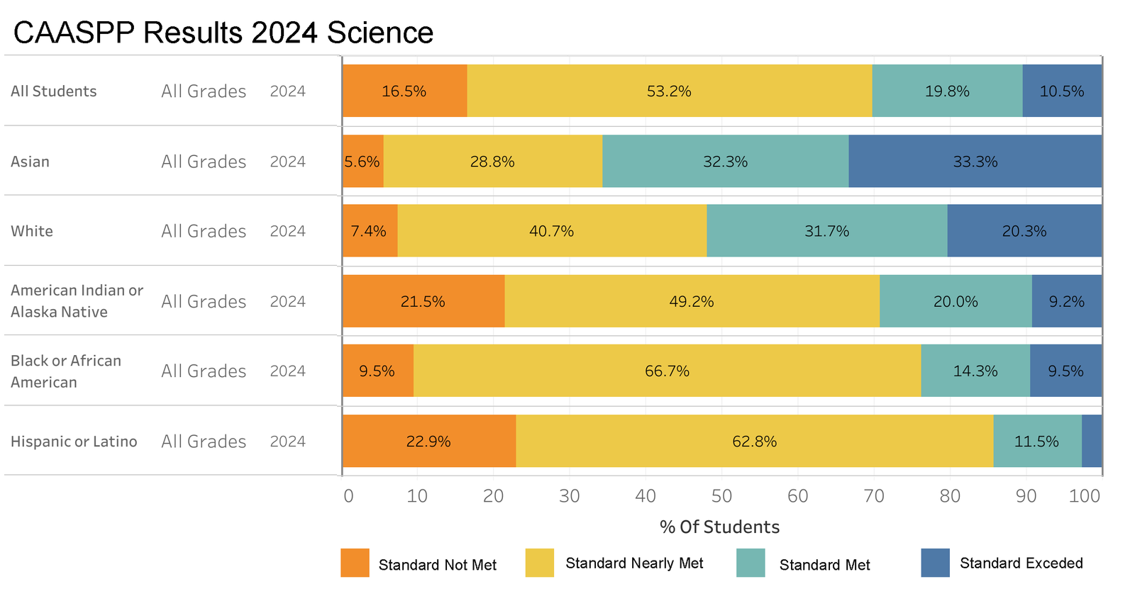 This bar chart represents the performance of various student groups on the 2024 CAASPP Science test, broken down by achievement levels: Standard Not Met, Standard Nearly Met, Standard Met, and Standard Exceeded. The data reveals a diverse range of outcomes among different ethnicities, highlighting both areas of strength and opportunities for targeted improvement. Asian students lead in surpassing the standards, whereas Hispanic or Latino, and Black or African American students show substantial proportions nearly meeting the standards, indicating potential for educational advancements with focused support. This analysis is crucial for educators and policymakers as it underscores the need to tailor educational strategies and resources to meet the specific needs of each student group to enhance their scientific literacy and overall academic success.