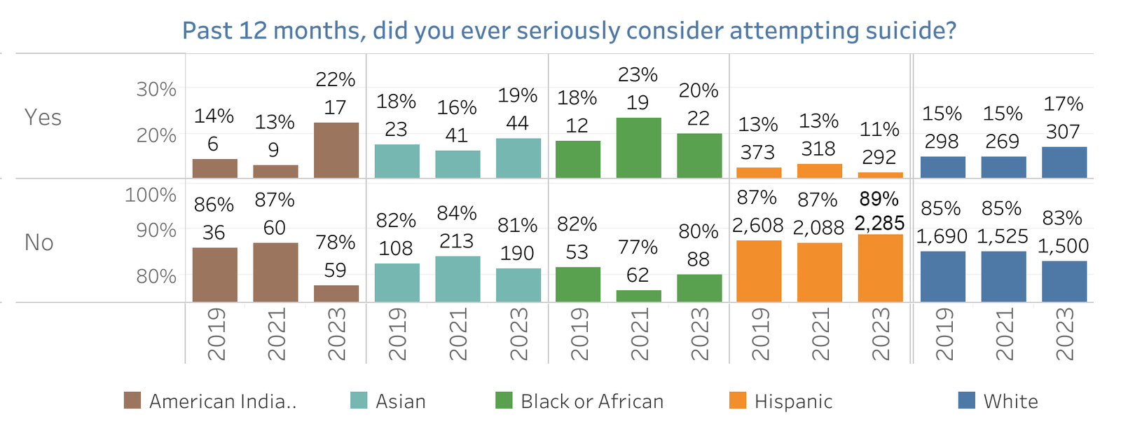 This chart details responses from the California Healthy Kids Survey concerning students' considerations of suicide over several years, segmented by ethnicity. The data underscores a troubling but important issue: a consistent minority of students across all groups reported having seriously considered attempting suicide, with the percentages typically ranging from 13% to 23% annually. Notably, the Hispanic group showed a higher percentage in some years compared to others. The majority of students, however, reported not having considered suicide, which remains reassuring. Nonetheless, the persistent presence of these considerations across all groups calls for continued and enhanced mental health support in schools to address and mitigate these concerns effectively.