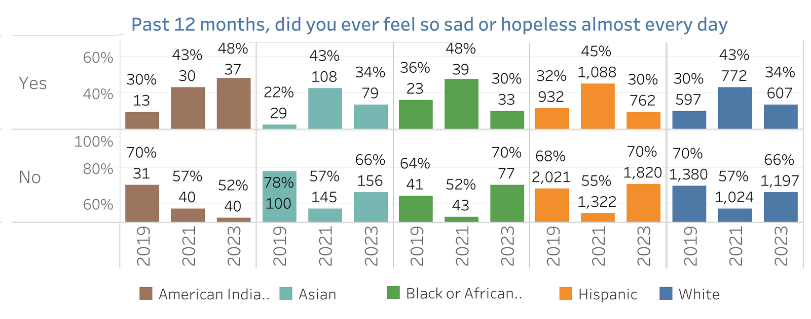 This chart provides a visual breakdown of the responses to a key mental health indicator from the California Healthy Kids Survey, focusing on the frequency of feelings of sadness or hopelessness among students from various ethnic backgrounds over several years. It starkly highlights that a significant portion of students across all groups have experienced these feelings almost every day, with varying rates that sometimes exceed 40% in certain years. Notably, the trend appears consistent across different ethnic groups, suggesting a widespread issue that affects students irrespective of their racial or ethnic background. This data underscores the critical need for enhanced mental health support and resources within schools to address these prevalent issues of sadness and hopelessness among students.