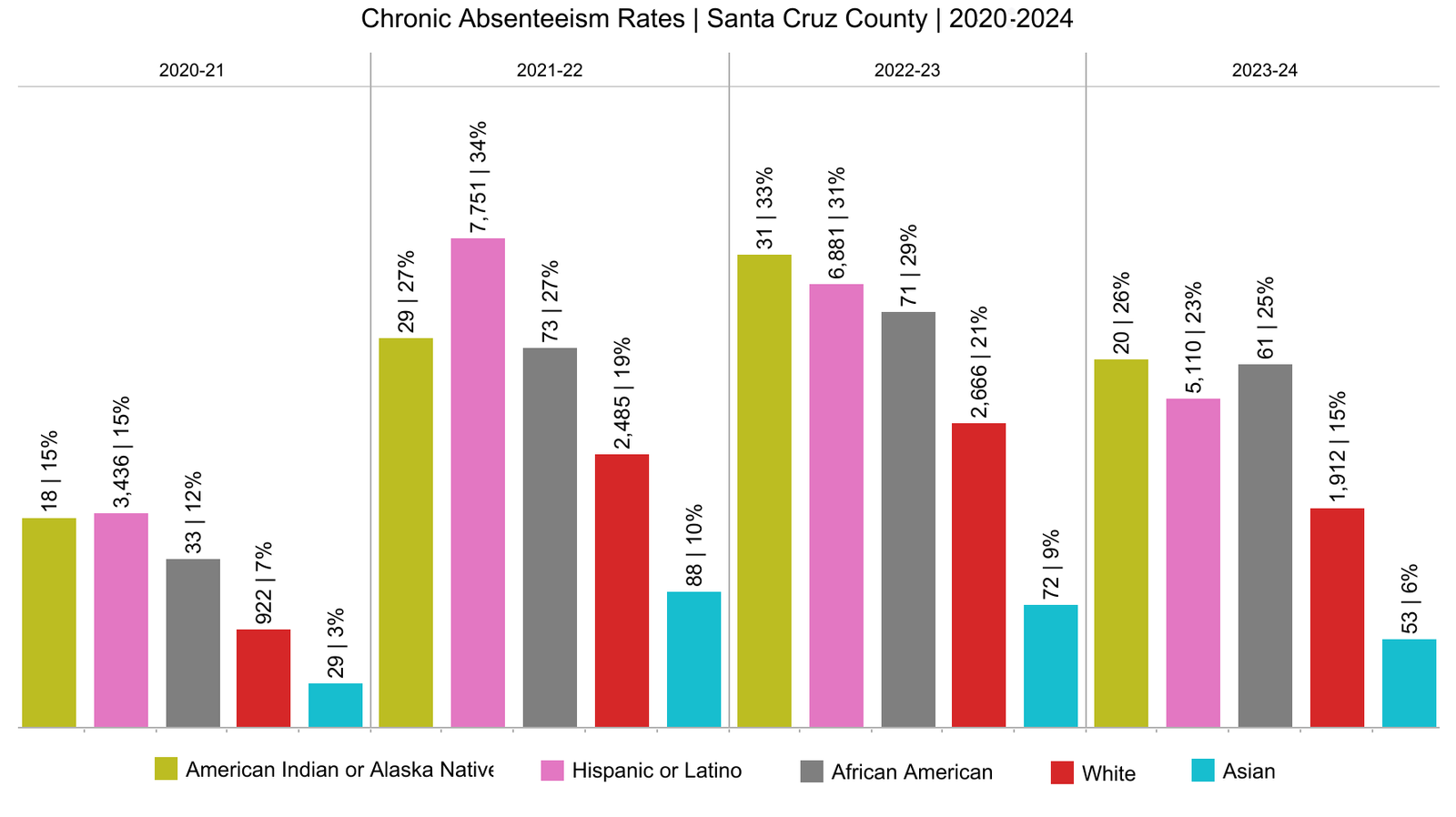 This chart displays the chronic absenteeism rates among different ethnic groups in Santa Cruz County from 2018 to 2024. Chronic absenteeism is defined as missing 10% or more of school days for any reason. The data shows that absenteeism rates vary significantly across different groups and years. Over the years, each group has experienced fluctuations in absenteeism, with certain trends indicating increased rates post-2020, possibly due to the impacts of the COVID-19 pandemic. American Indian or Alaska Native and Hispanic or Latino students consistently show higher absenteeism rates compared to other groups, highlighting potential areas for targeted intervention and support to improve attendance and, consequently, educational outcomes. This information is crucial for developing strategies that address the specific needs of these communities to foster better engagement and success in school.