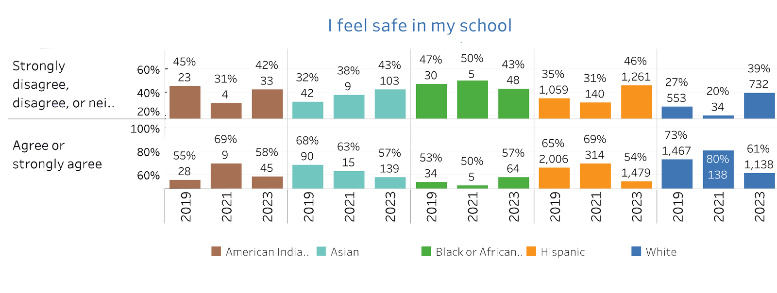 The chart from the California Healthy Kids Survey illustrates student perceptions of safety in school across various ethnic groups from 2019 to 2023. Most student groups consistently reported feeling safe at similar levels, with a majority indicating agreement with feeling safe. However, there were slight declines in the perception of safety over the years for American Indian, Asian, Black, and Hispanic students. White students showed a temporary increase in perceived safety in 2021, but this level dropped again by 2023, aligning with the general trend observed in other groups.